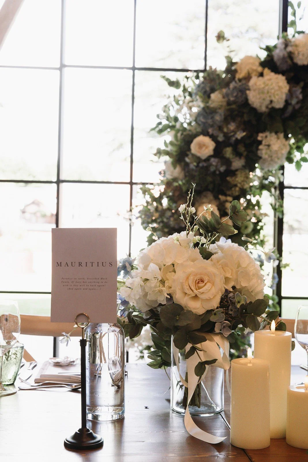 A wedding reception table decorated with a large white floral bouquet, candles, and a sign labeled 'Mauritius' with a poem. Large windows in the background let in natural light.